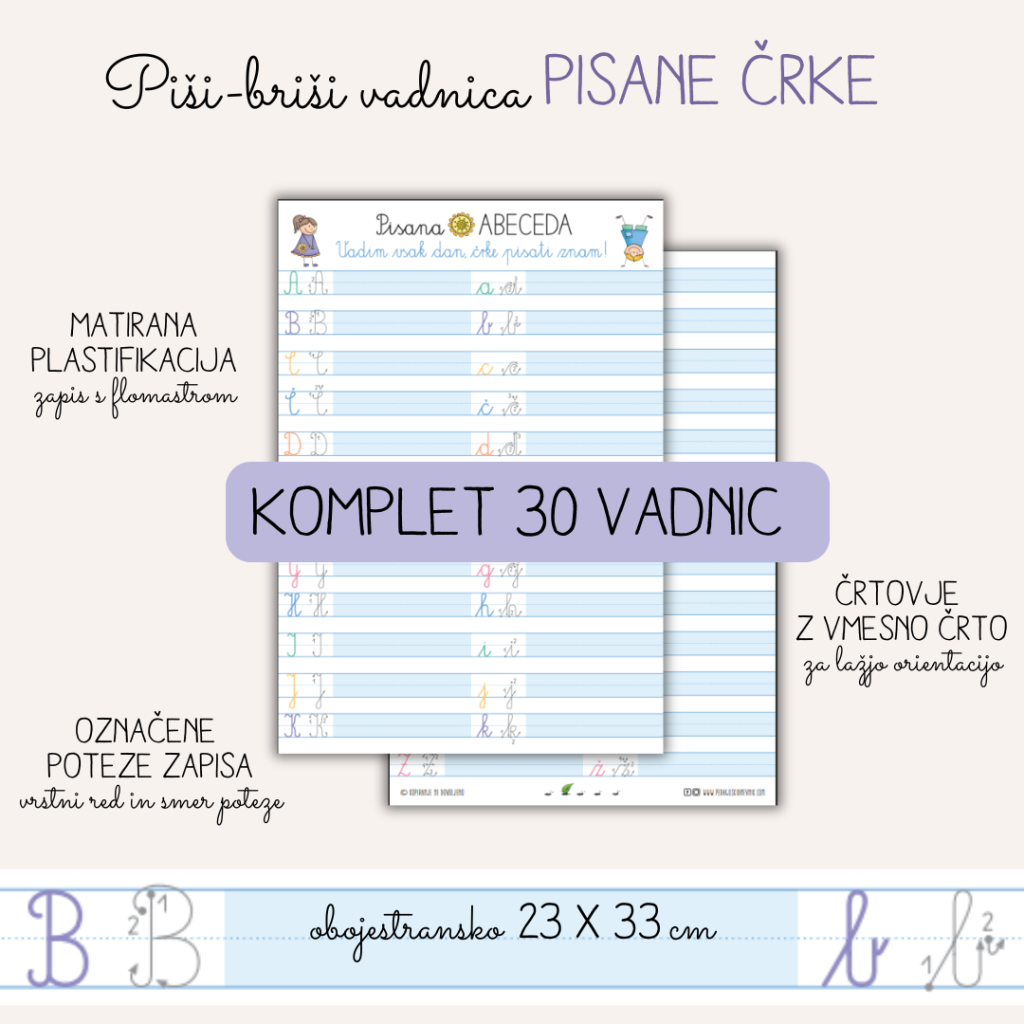 Komplet vsebuje 30 obojestranskih VADNIC s pisanimi črkami. Več