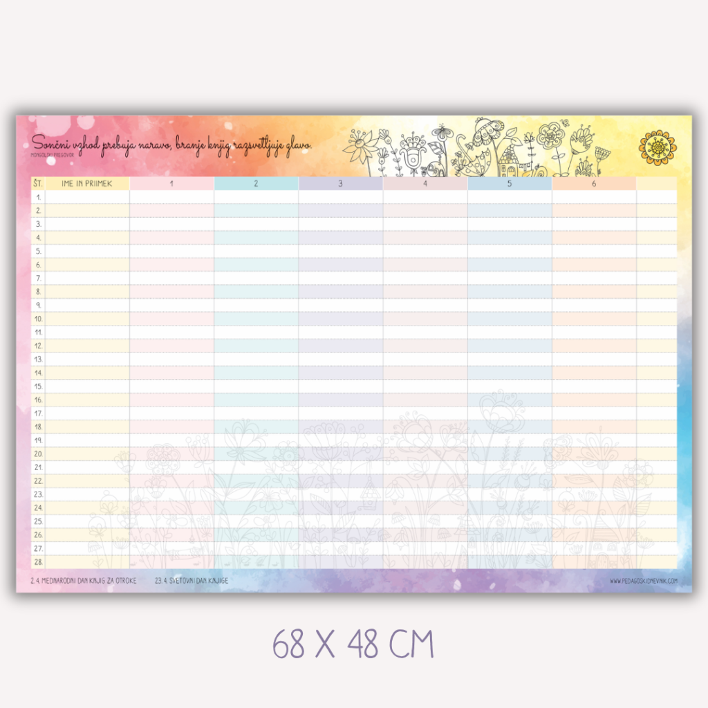 Plakat je uporaben pripomoček, ki omogoča zapis prebranih knjig za 28 otrok, jih spodbuja k branju in hkrati krasi učilnico ali igralnico.