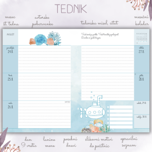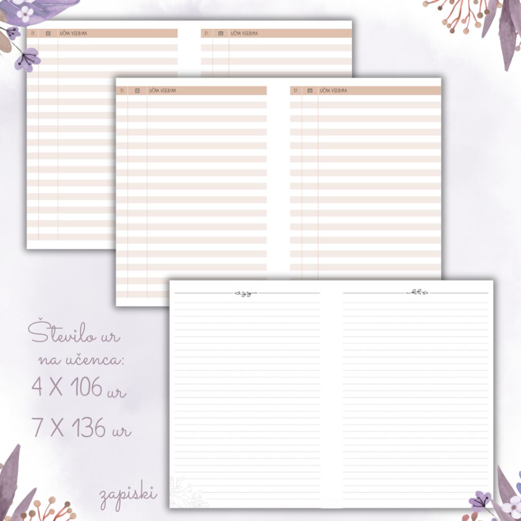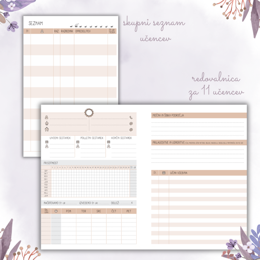 Vsebuje preglednice za organizacijo, načrtovanje in spremljanje pedagoškega dela, tednik, prostor za obravnavo 11 učencev ter zapiske.