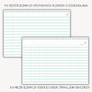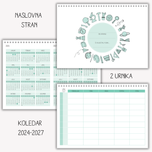Urnika, tedniki (44) brez datumov s črtno stranjo za dodatne zapise, mrežni (8) in vrstični (9) seznami za evidence.